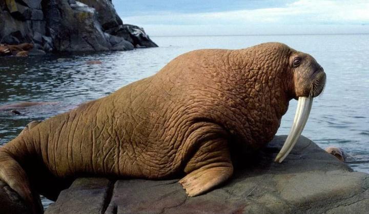 海象主要生活在寒冷的北极海域,它们的身体又重又长,皮又厚又皱;它们的四肢因适应水中生活已经退化成鳍状;它们的鼻子短短的;它们的耳朵没有耳壳,看起来十分丑陋。虽然海象很丑,但却身怀绝技,主要就是靠那对长长的牙。