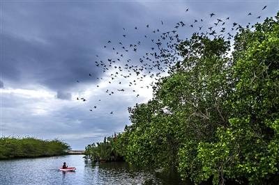 红树林的种子外表似四季豆,垂挂在藤架上,在母树上发芽,成长为幼苗后脱落掉到海水中,像轮船抛锚一样插入泥沙,并且发育成一株小树。有时,尚未固定在泥沙中的幼苗遇上潮汐,会被海水卷走,但待到退潮时,幼苗又会随遇而安地在别处扎根生长。年复一年,红树林就依靠这种奇特的生长方式繁衍着,盘根错节、相互支撑的结构在风浪中稳如泰山,既消解了风浪的冲击,起到稳固堤岸的作用,也起到了保护滩涂、净化海水的作用。而且,红树林还是海鸟等海洋生物的乐园呢!