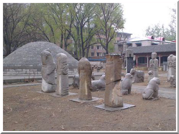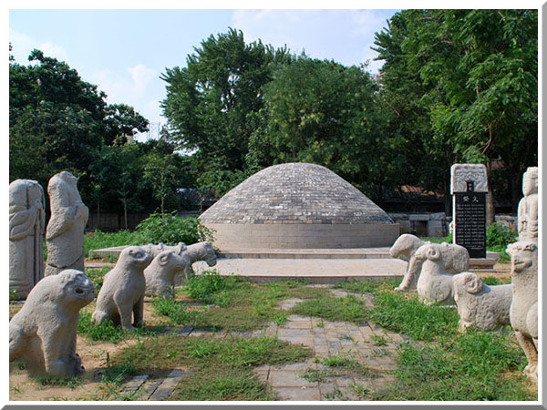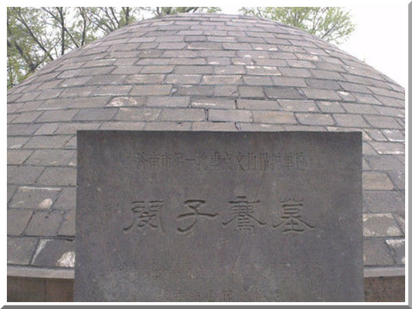 位于济南百花公园西邻的济南孝文化博物馆。进大门,迎面是一处新建的仿古庙堂,墙上有一个写有“济南孝文化博物馆”的牌子,北侧立着一块刻有“闵子骞墓”字样的石碑,上面还有第一批市级重点文物保护单位的说明。上世纪60年代前,闵子骞墓规模还很大,当时墓区南北长约300米,东西宽200米,墓堆封土直径有七八米,高约十几米,周围还有合抱粗的古树30余棵,历代碑刻十余尊。但后来“文革”时,整个墓区遭到严重破坏,祠堂被拆掉,碑刻被毁,古树被砍,仅剩两棵,封土被挖去烧砖瓦。近年来,随着许多市民要求恢复保护闵子骞墓地的呼吁,和文物部门的努力,在市政府的支持下,他们先后投资180多万元,对墓园进行了修膳。墓园西侧的南北向道路命名为闵子骞路。欧阳中石题字。再沿着庙堂往北走,20多米处就是一座突起的坟墓。只见该坟墓高约3米,封土直径约5米,呈圆形,四周有多尊石羊、石马、石狮、石龟等石像,还有两棵古树。